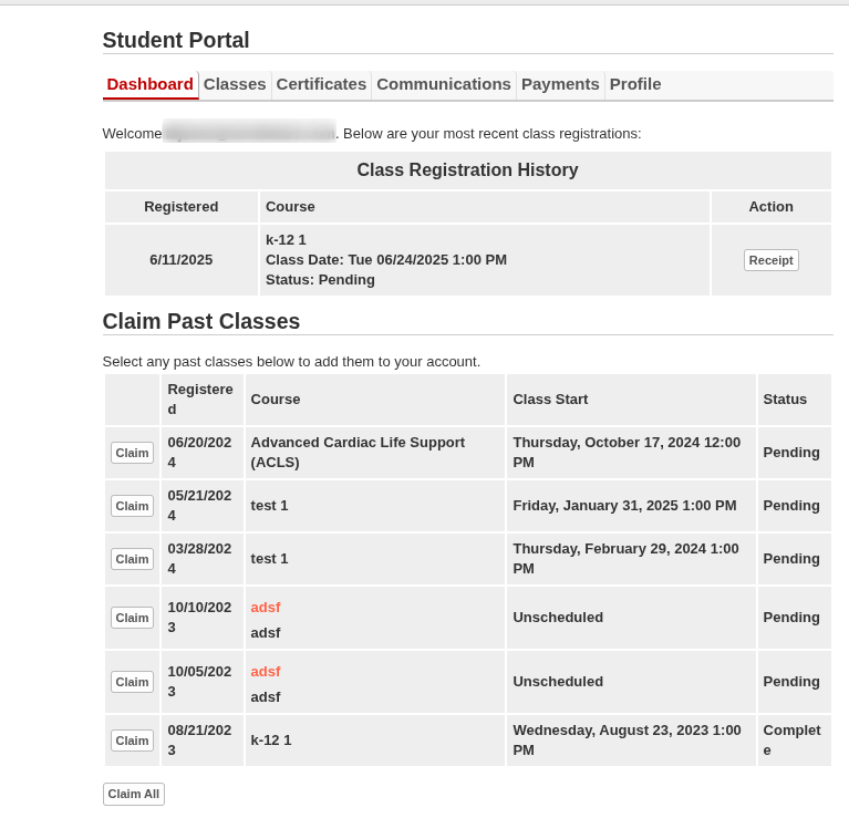 Dashboard will have their registration history with the receipt and any classes that are available for them to claim to their account