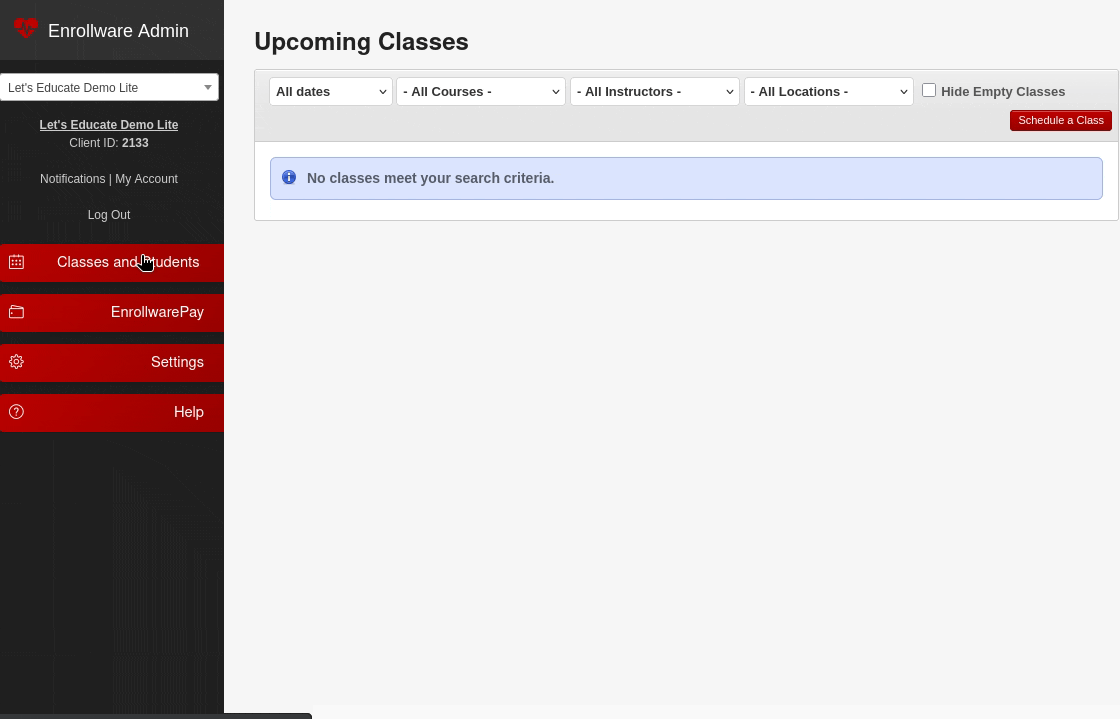 - Classes and Student- will show your upcoming and past classes. Schedule a class, search for students, view unscheduled students, and manage shipping.