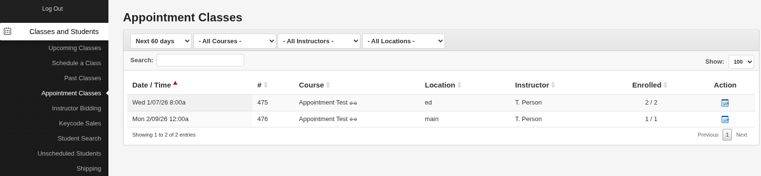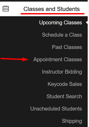 To see your all of your Appointments after students register, navigate to your Classes and Students Tab > Appointment Classes, where your classes will appear after a student has scheduled an Appointment class.