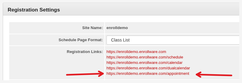 Once activated, the Appointment options will appear under your Settings tab and Classes and Students tab. Your account will also have a registration link for Appointment classes.