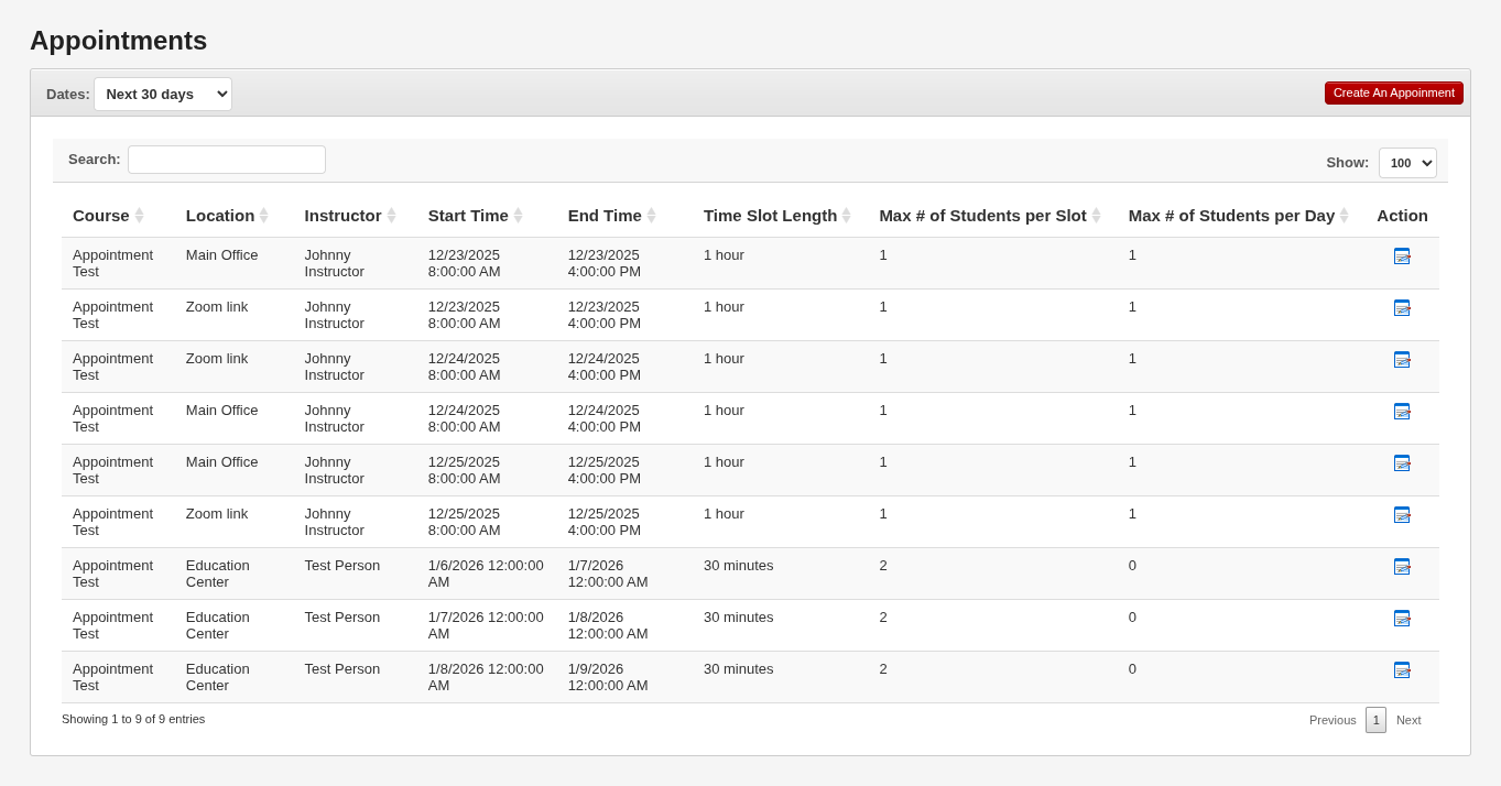 In the Appointments section, you will be able to start scheduling your appointment classes by selecting the Create An Appointment button on the upper right-hand corner IF the courses have been activated to be able to schedule appointments. This is done for each Course Type.