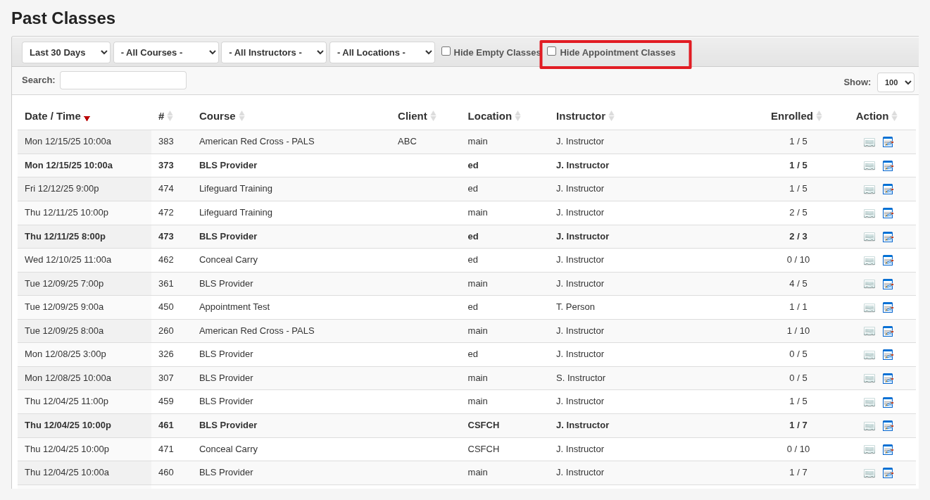 Your Appointment classes will also appear in your Upcoming and Past Classes sections. You can filter to hide the Appointment classes by selecting the Hide Appointment Classes option.
