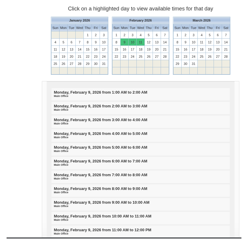 When a date is selected, the available times are then shown, and the registration process is the same as for a normal registration.