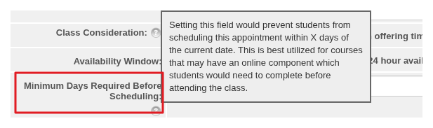Minimum days requirement before scheduling prevents students from scheduling an appointment within a certain number of days from the current day.