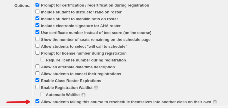 Select the course you would like to enable this feature for and scroll down to the options section. Select the Allow students taking this course to reschedule themselves into another class on their own.