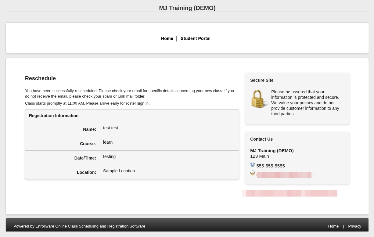 If yes is selected to reschedule, the following page will show the new confirmation for the rescheduled class. They will also receive a new confirmation email for the new class.