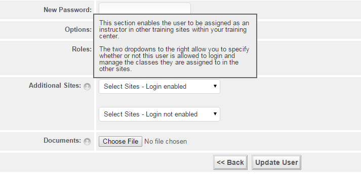 Login not enabled only allows the instructor to be assigned to teach a class and be listed under the instructor drop down for the training site, no training site access is provided with this selection. Click “Update User” when complete.